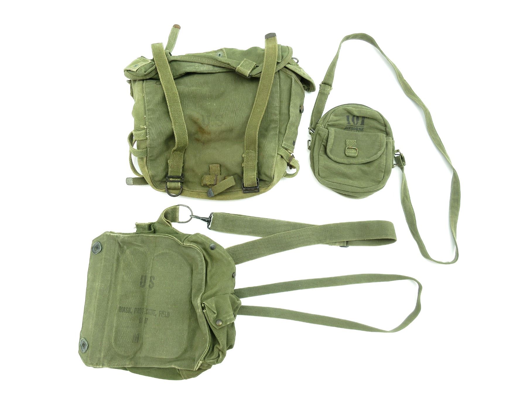 LOT INCLUDES; (1) M-1945 COMBAT FIELD PACK, MARKED: "U.S.", "HAMELCO, 1944" & "PACK, FIELD, COMBAT, M-1945" ETC., GREEN CANVAS, VARIOUS STRAPS, SHOWS AGE / WEAR, (1) GREEN CANVAS GAS MASK BAG, MARKED: "US, MASK, PROTECTIVE, FIELD, M17, M", WITH SHOULDER STRAP, SHOWS AGE / WEAR & (1) REPRODUCTION 101ST AIRBORNE DIVISION GREEN CANVAS BAG WITH SHOULDER STRAP, ZIPPERED (WORKS). SEE PHOTOS.