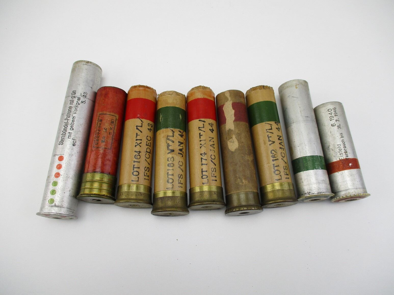 WWII SPENT FLARE CASINGS , (6) CARDBOARD CASINGS, ASSORTED MARKINGS. (3) ALUMINUM CASINGS, ASSORTED MARKINGS.