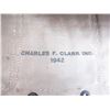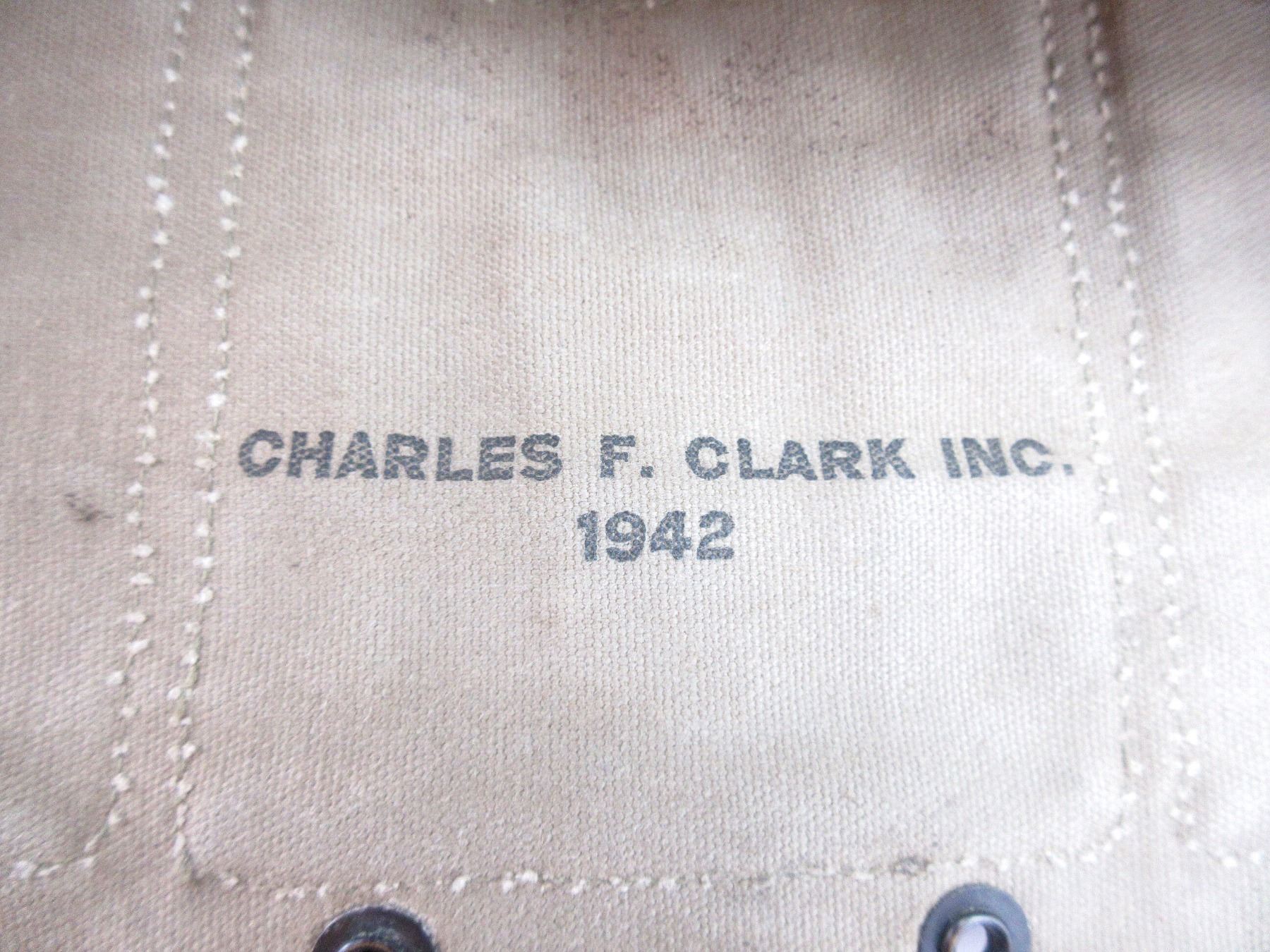 (1) TAN CANVAS AMMO BELT WITH 6-POCKETS, MARKED: "U.S." & "CHARLES F. CLARK INC., 1942", METAL FITTINGS, OAL APPROX. 34.25". SEE PHOTOS.