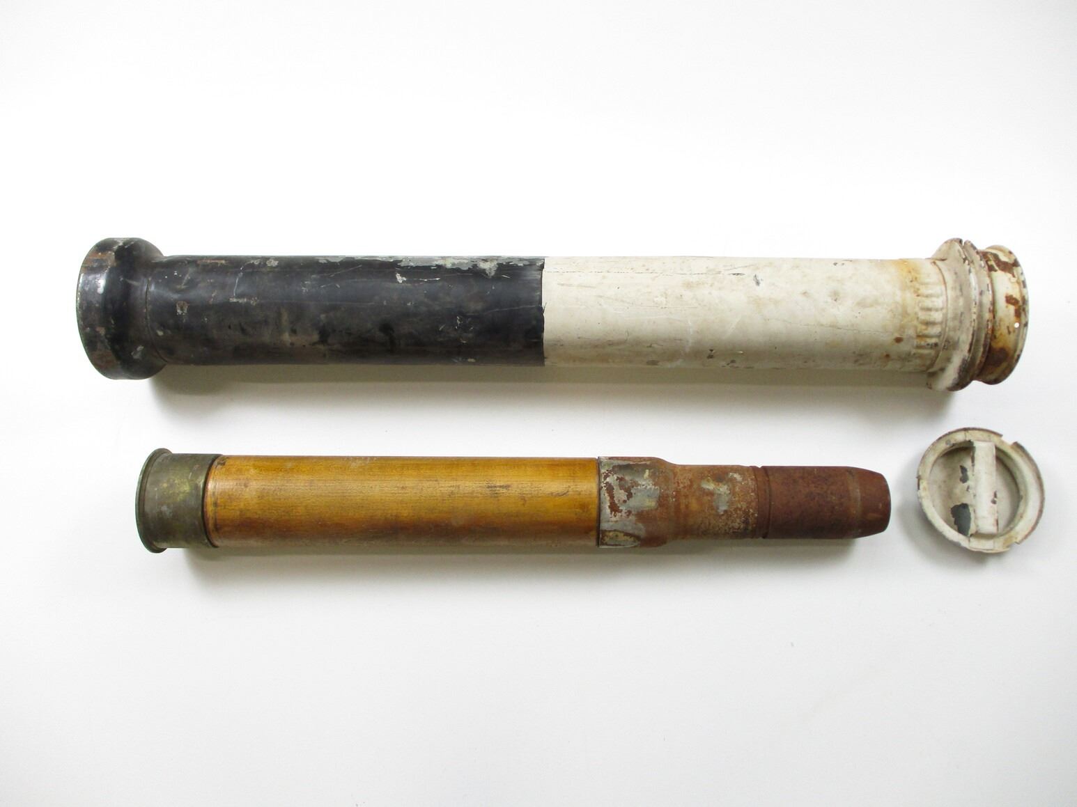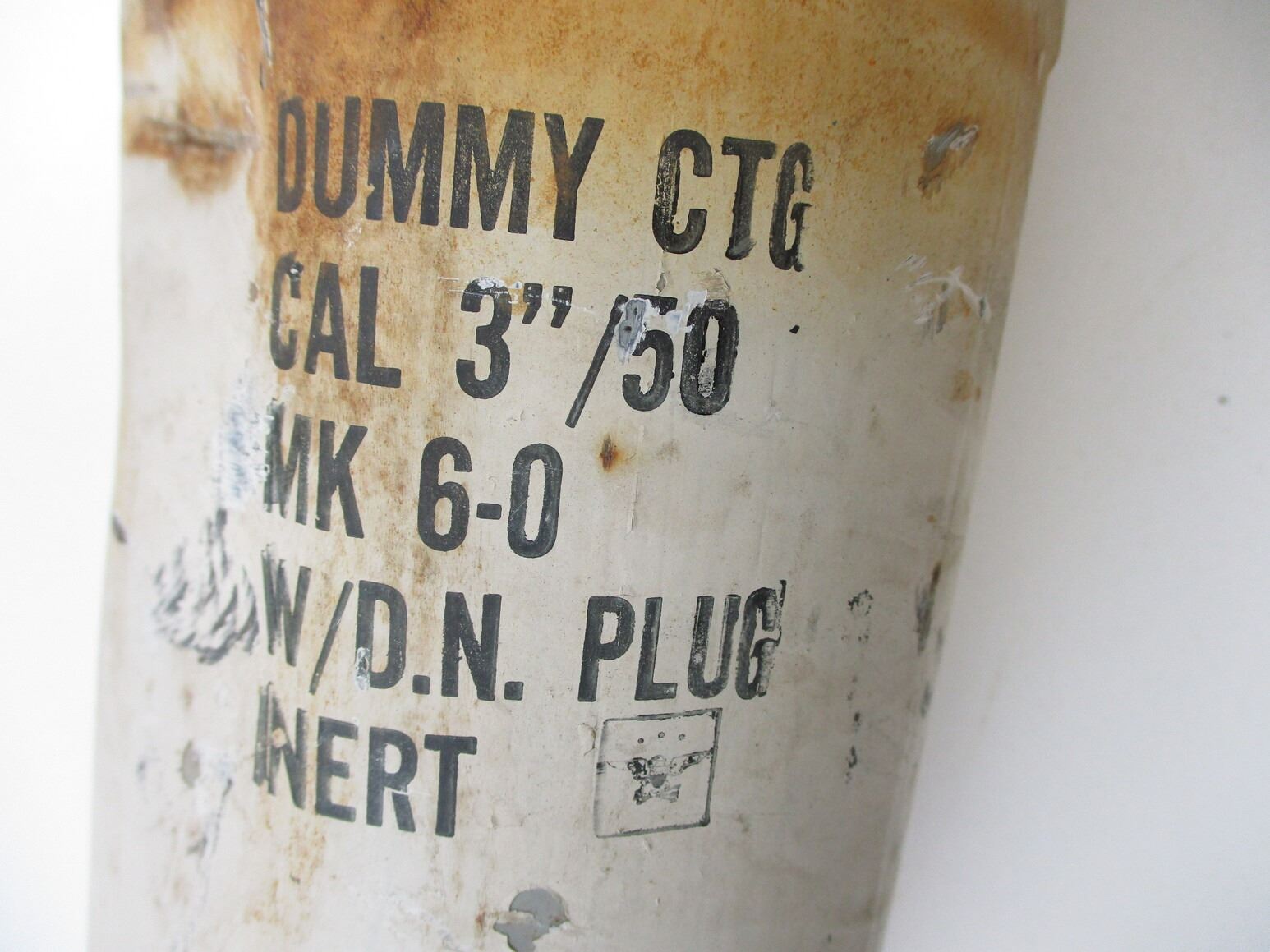 WWII U.S. NAVY 3" .50 CAL. TRAINING ROUND AND STORAGE CONTAINER LOT, LOT INCLUDES; (1) OAK TRAINING ROUND WITH BRASS BASE & METAL FRONT BAND, METAL IS RUSTY, MARKED: "CARTRIDGE MK ?, 50 CAL, SHC", APPROX. DIA. 4.25" & OAL APPROX. 29 3/8" & (1) METAL STORAGE CONTAINER (DAMAGED), MARKED: "DUMMY CTG, CAL 3"/50, MK 6-0, W/D.N. PLUG, INERT", APPROX.6.25" DIA. & OAL APPROX. 37.25". SEE PHOTOS., THESE CAN ONLY BE SHIPPED BY CORPORATE UPS COVERED AREAS. PLEASE GO TO LOT 0 IN THE AMMUNITION SESSION, TO SEE IF YOUR POSTAL CODE IS A VALID AREA. THESE CAN NOT BE SHIPPED TO THE USA, OR INTERNATIONALLY. NO REFUNDS WILL BE ISSUED, OR BIDS RETRACTED.