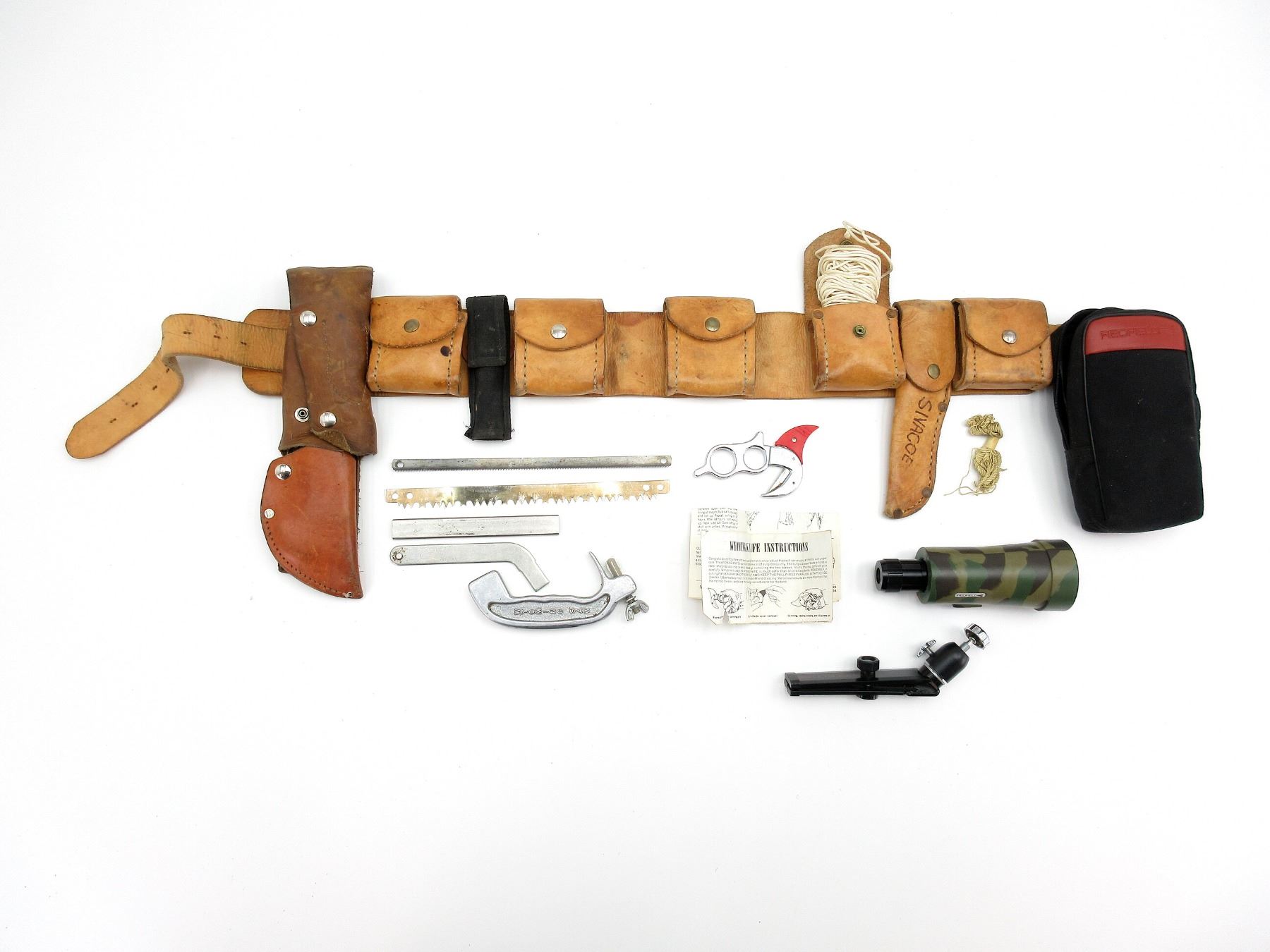 LOT INCLUDES; (1) SET OF WYOMING KNIVES FOR FIELD DRESSING LARGE GAME, INCLUDES SIX ASSORTED BLADES / PIECES, IN BROWN LEATHER BELT POUCH, (1) REDFIELD UNKNOWN SPOTTING SCOPE, CLEAR OPTICS, WITH BELT CARRYING BAG /TRIPOD MOUNT & TRIPOD, (1) BROWN LEATHER AMMO POUCH BELT, WITH FIVE AMMO STYLE POUCHES / ONE KNIFE SHEATH & ONE BLACK NYLON FLASHLIGHT POUCH ATTACHED, OAL APPROX. 47". SEE PHOTOS.