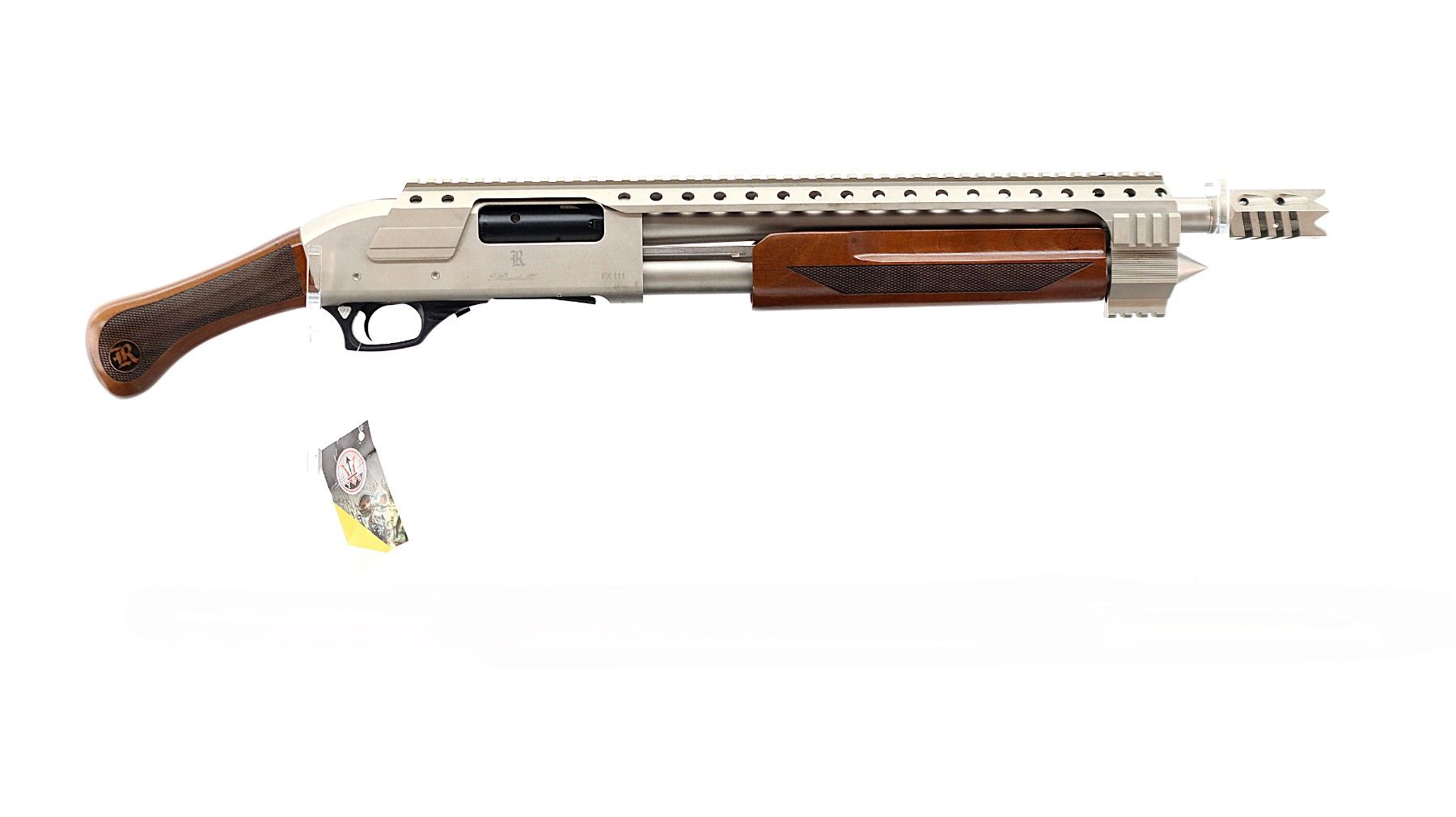 Main Description: New Factory Refurb, May have been tested in factory. No sights, stainless barrel, silver alloy receiver, full length rail on receiver and barrel. Two piece wood stocks, finger grooved checkered forearm and pistol grip, spiked mag cap, three short rails, retains factory hand tag. Accessories include: Spare Extra Full, Full, IM, Mod and IC Chokes with wrench.