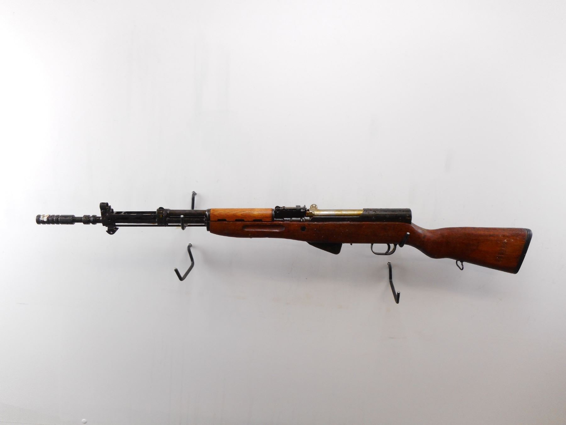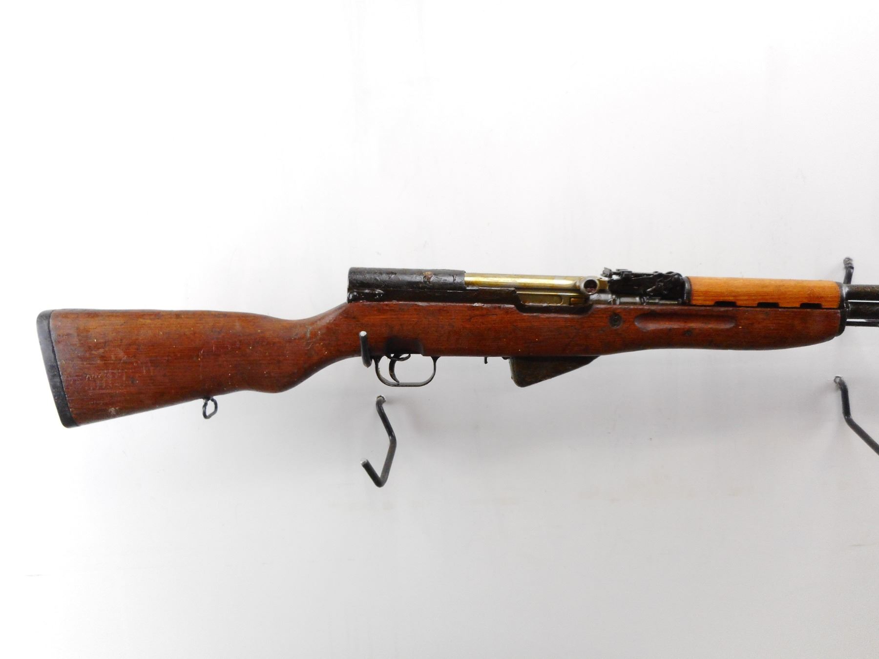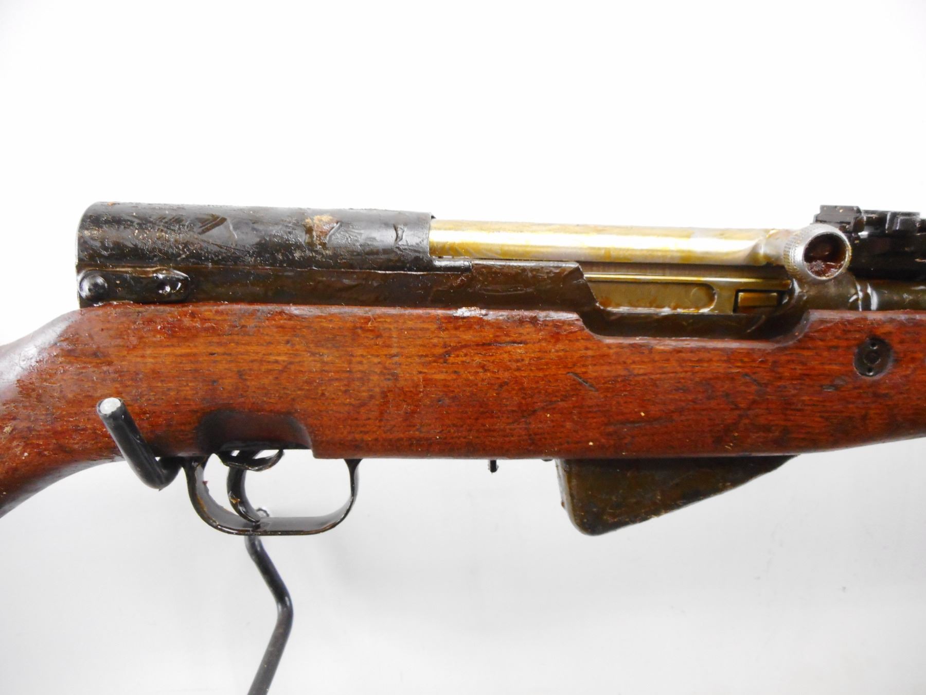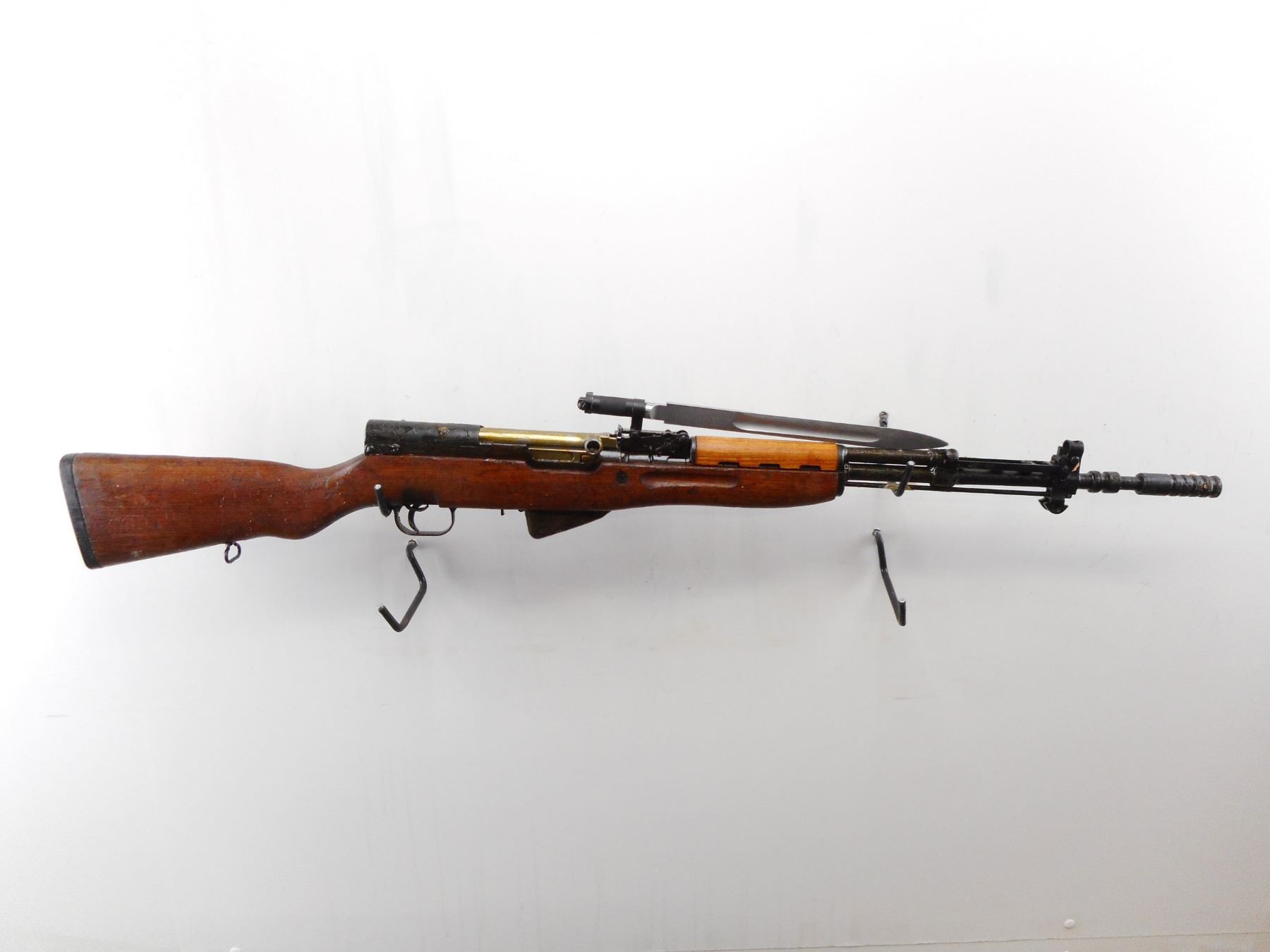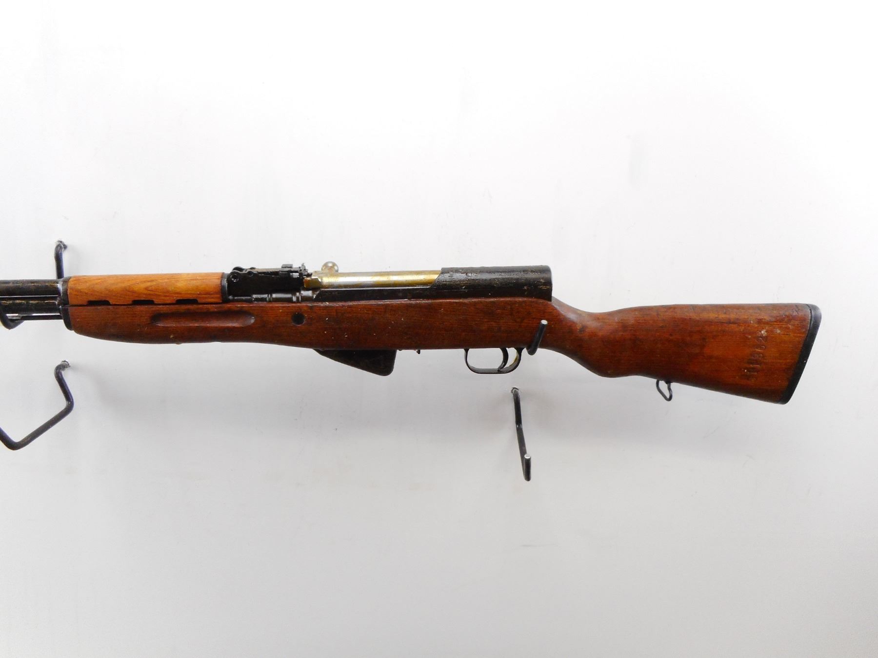 YUGOSLAVIA, MODEL: M59/66 SKS, CALIBER: 7.62 X 39, COMES WITH BAYONET , ALL MATCHING. THE ENTIRE FIREARM IS COVERED IN COSMOLINE, UNABLE TO VERIFY BORE CONDITION. BLADE FRONT SIGHT WITH HOOD. ADJUSTABLE U NOTCH REAR SIGHT. NIGHT SIGHTS. INTEGRAL GRENADE LAUNCHER WITH SIGHT. TWO PIECE SMOOTH FULL MILITARY STOCKS. BLACK RUBBER RECOIL PAD WITH TRAP. SLING SWIVELS, CLEANING ROD. COULD SHOW SOME HANDLING MARKS AND WEAR, UNABLE TO DETERMINE, ACTION: SEMI AUTOMATIC RIFLE , BARREL LENGTH: 20 1/2", CONDITION: IN COSMOLINE, SERIAL # 611362, CLASS: CANADIAN NON RESTRICTED CLASS
