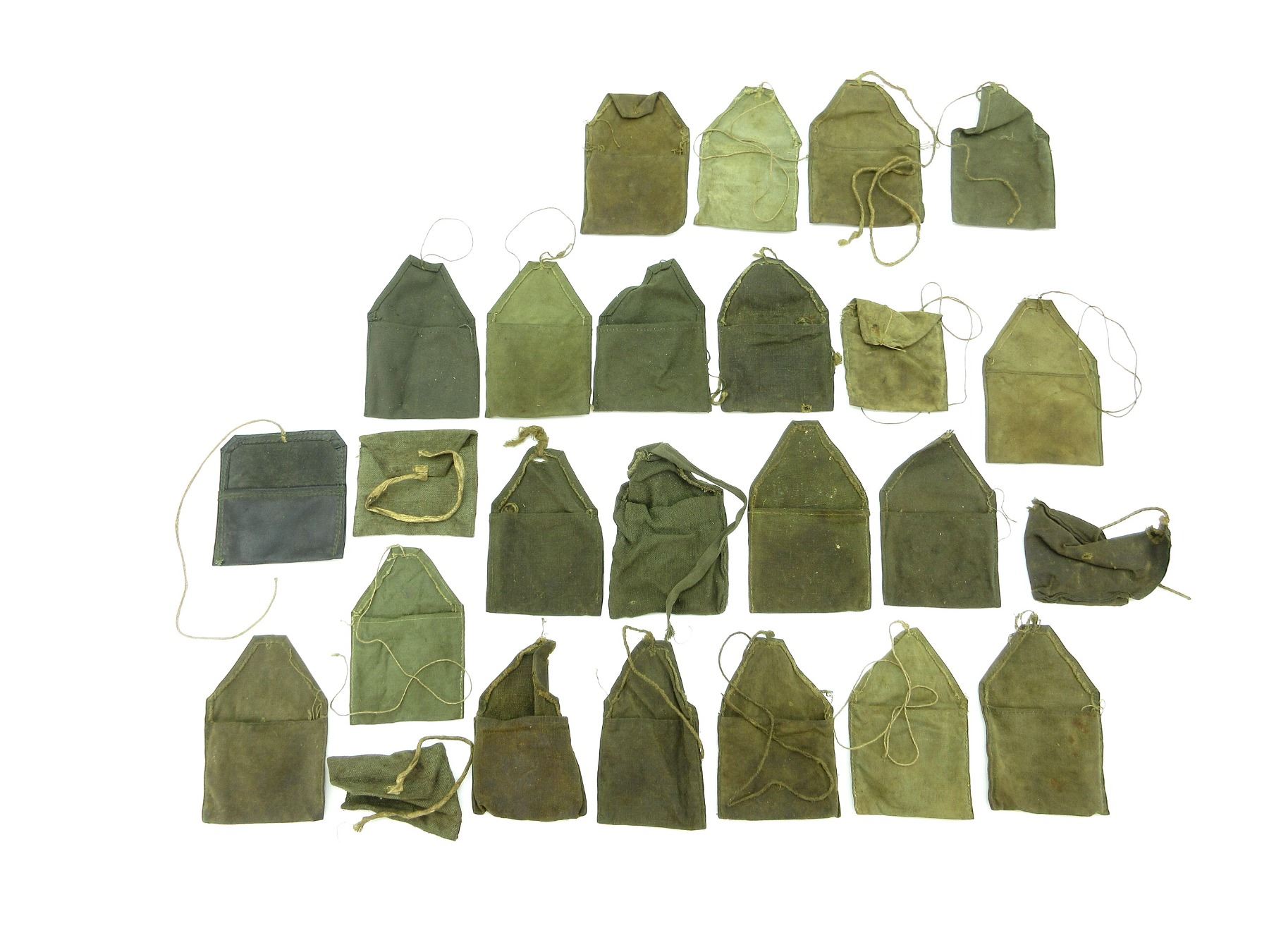 LOT INCLUDES; APPROX. (25) VARIOUS COLOURED CANVAS MG PARTS POUCHES (EMPTY), ONE WITH FAINT INK STAMP, ONE BLUE LEATHER POUCH, SOME WITH ROPE / CANVAS TIES, SHOWS WEAR / TEAR, OAL APPROX. 3" TO 4.75". SEE PHOTOS.