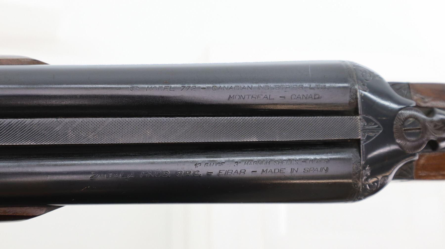 Main Description: Brass bead, blued finish, raised solid rib, engraved receiver, automatic safety, extractor, double triggers. Two piece wood stocks, checkered Beavertail forearm and pistol grip, small crack behind upper tang, brown rubber recoil pad, grip cap