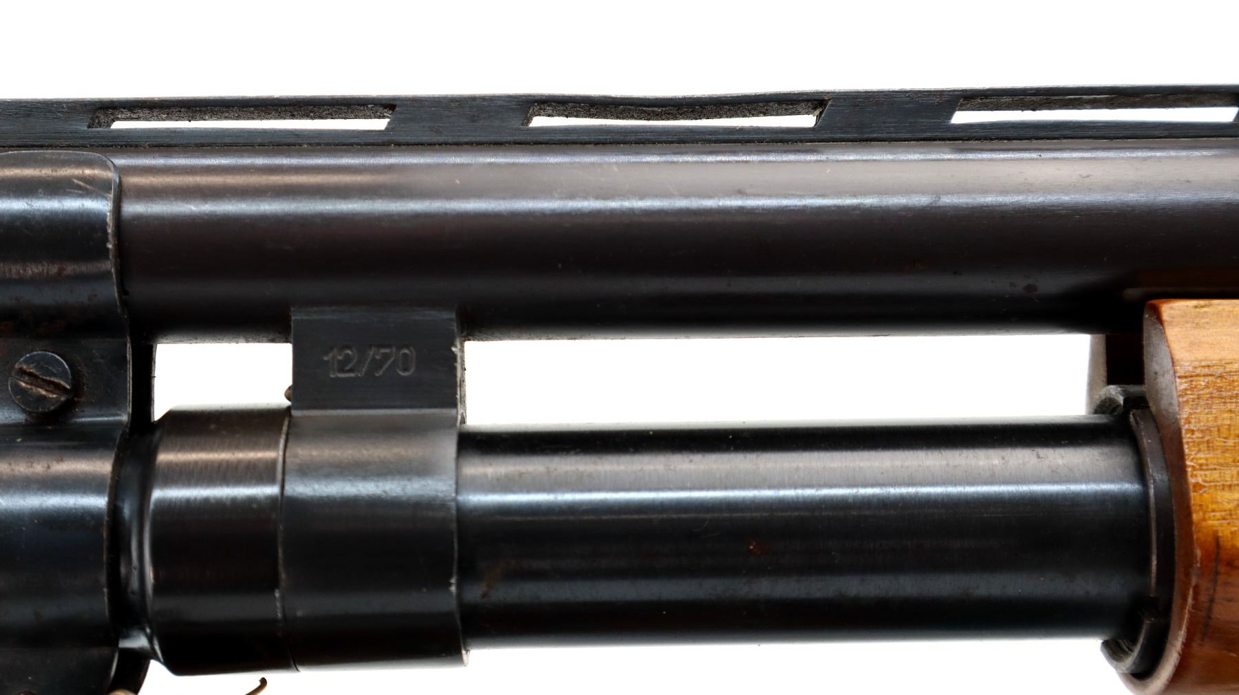 Main Description: Brass bead, blued vent rib barrel with three dents, black alloy receiver, missing magazine tube follower action not installed properly requires parts or repair. Two piece wood stocks, grooved forearm, pistol grip, grooved black polymer butt plate, sling swivels with brown leather sling and extended magazine tube.