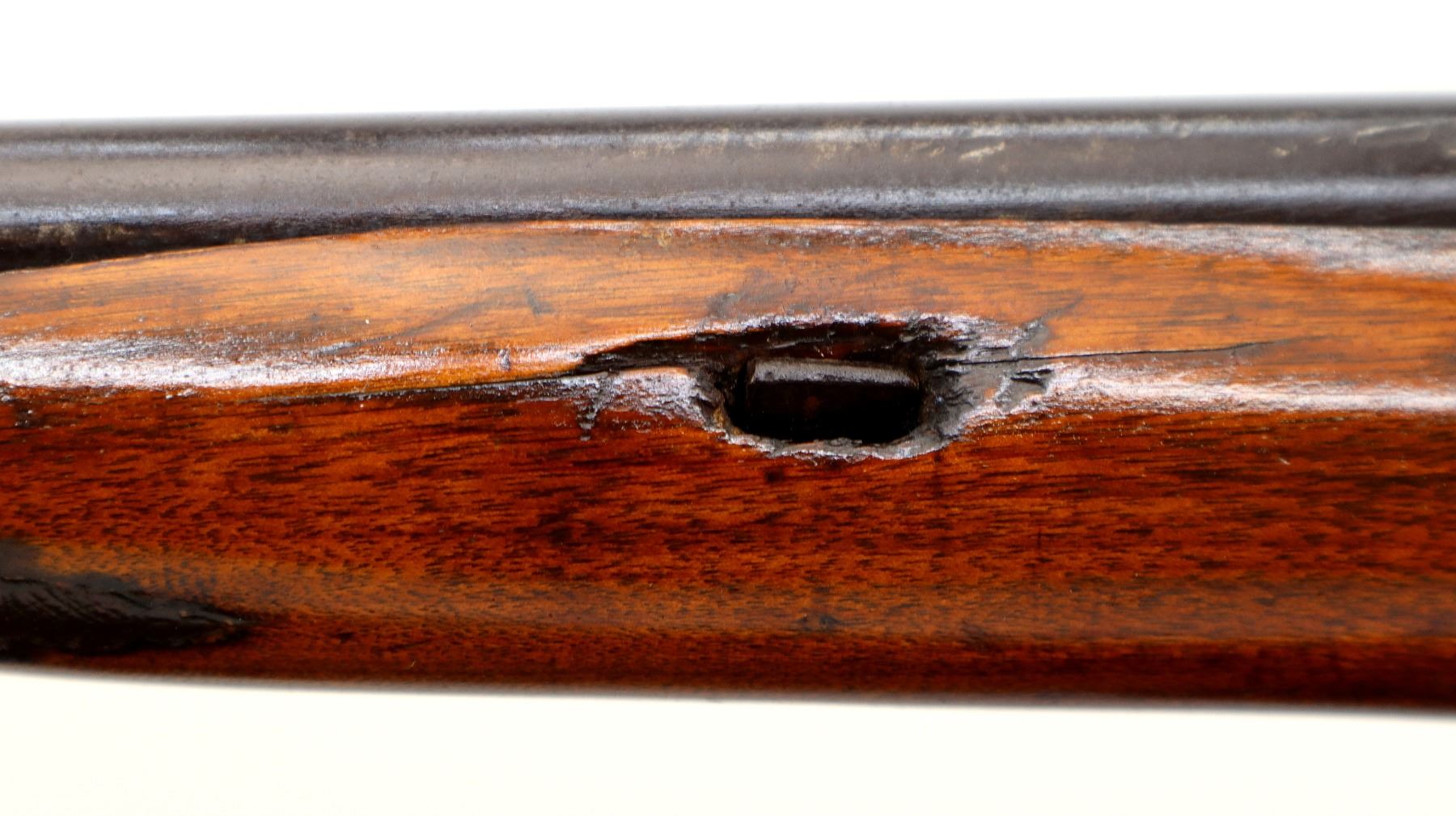 Wear: Metal finish turning brown with pitting, light rust, scratches, handling marks and wear. Stocks show marks, scratches and wear.