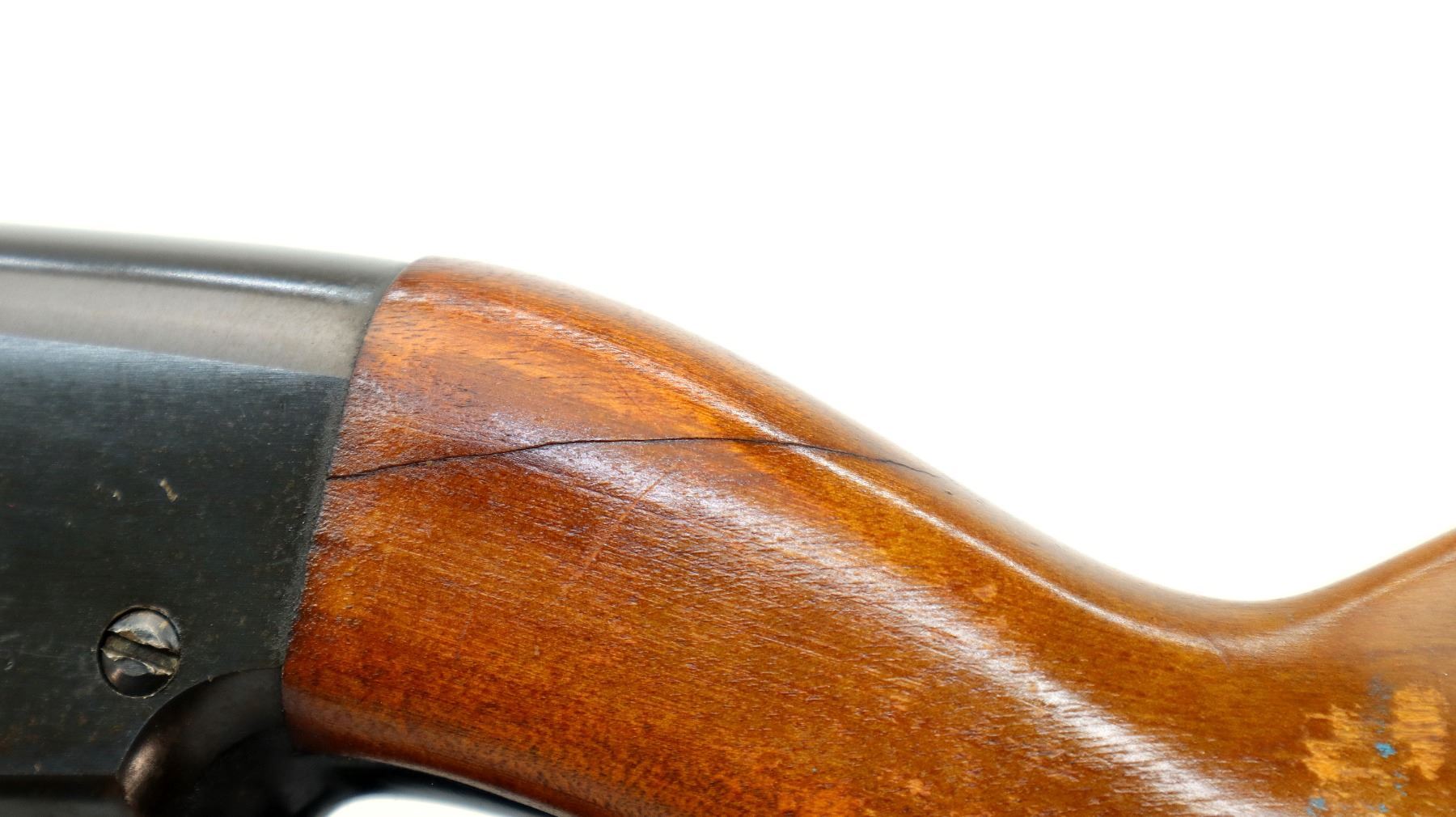 Main Description: Silver bead, blued finish, round barrel. Two piece wood stocks, grooved forearm, pistol grip cracked behind receiver, grooved black polymer butt plate.
