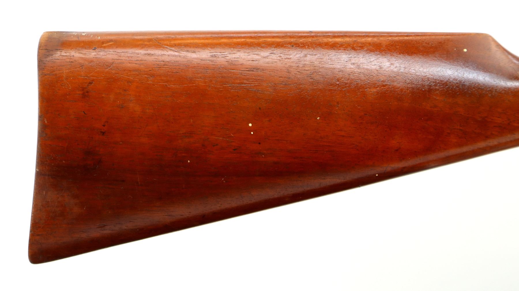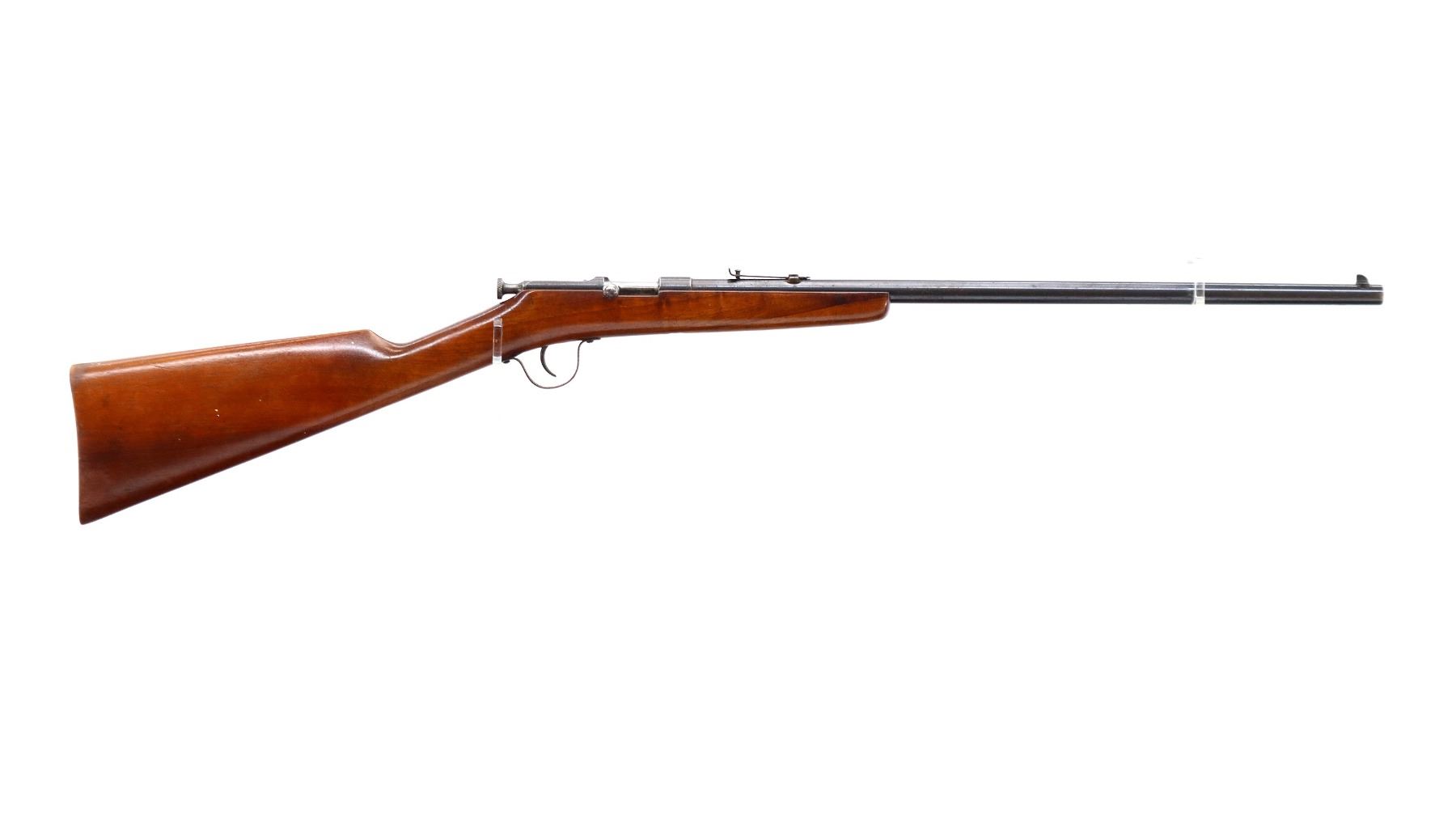 Main Description: Blade front sight, adjustable u notched rear sight, blued finish, silver bolt with straight handle, extractor is present. One piece wood stock, straight grip, smooth butt